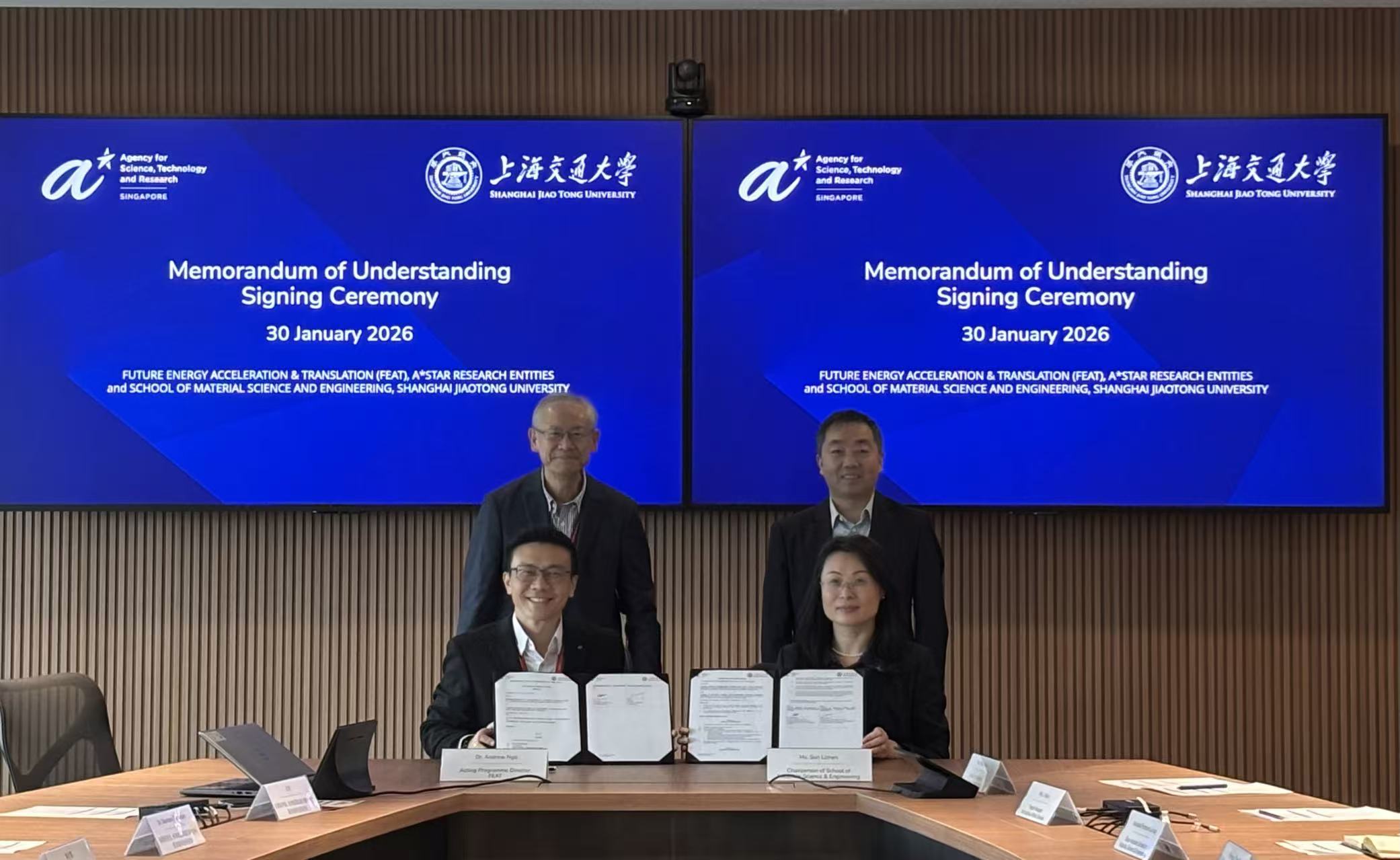 代表团访问新加坡科技研究局(A*STAR),与其下属的未来能源加速与转化中心正式签署谅解备忘录。在副校长曾小勤与新加坡科技研究局副总裁贺子森的共同见证下,樱花动漫 党委书记孙丽珍与未来能源加速与转化中心主任吴俊勇签署谅解备忘录。双方将围绕面向极端环境的先进材料技术开展联合研发与人才培养,整合双方在材料科学与工程、先进制造及未来能源领域的优势,加速技术创新与转化。