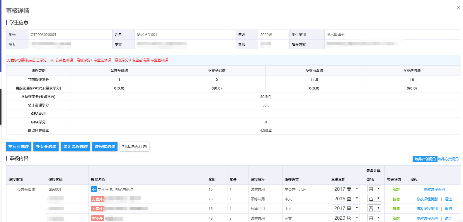 5.研究生新生培养计划为草稿状态即可选课;研究生老生培养计划须经导师审核通过后方可选课。