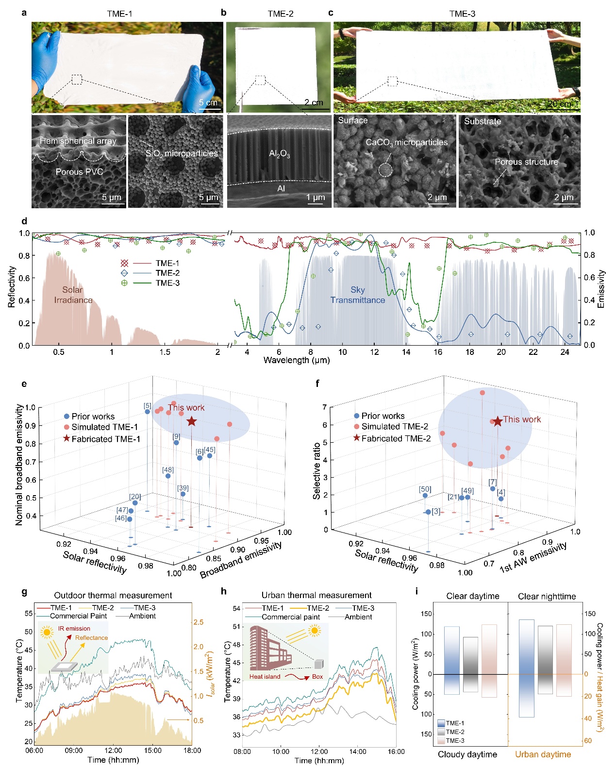 在多种户外场景实测中,所有热辐射超材料均展现出优异的自降温效果,并且不同类型的材料可适用于不同的应用环境,就像给物体根据应用环境不同披上了不同的“自动降温外套”。如,在晴朗的正午时分,宽波段超材料下表面温度相比环境温度降低了5.9℃;在多云条件下,单波段选择性超材料降温性能更显著,下表面温度相比环境温度降低了4.6℃;在城市建筑群模拟环境中,单波段选择性超材料下表面温度分别比宽带超材料和商用白漆涂覆表面低2.5℃和5.3℃。披上这层“自动降温外套”,表面温度明显下降,就像开启了天然制冷模式。